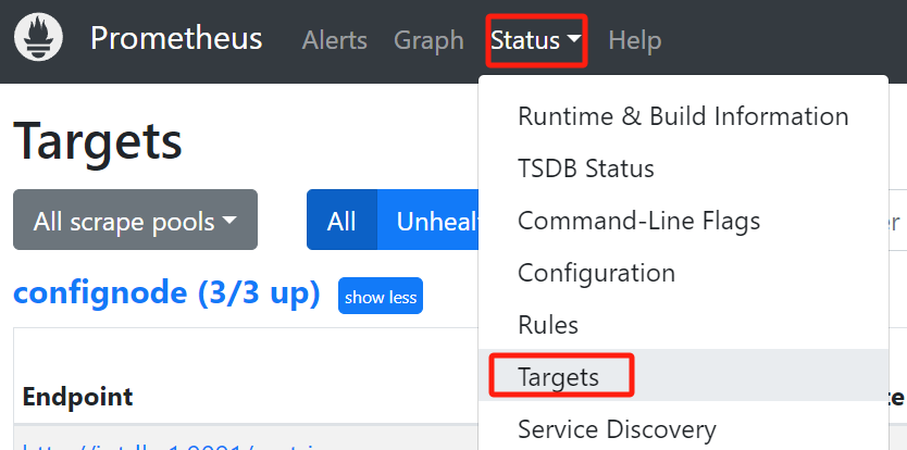 http://IP:port,进入Prometheus,点击进入Status下的Target界面,当看到State均为Up时表示配置成功并已经联通。