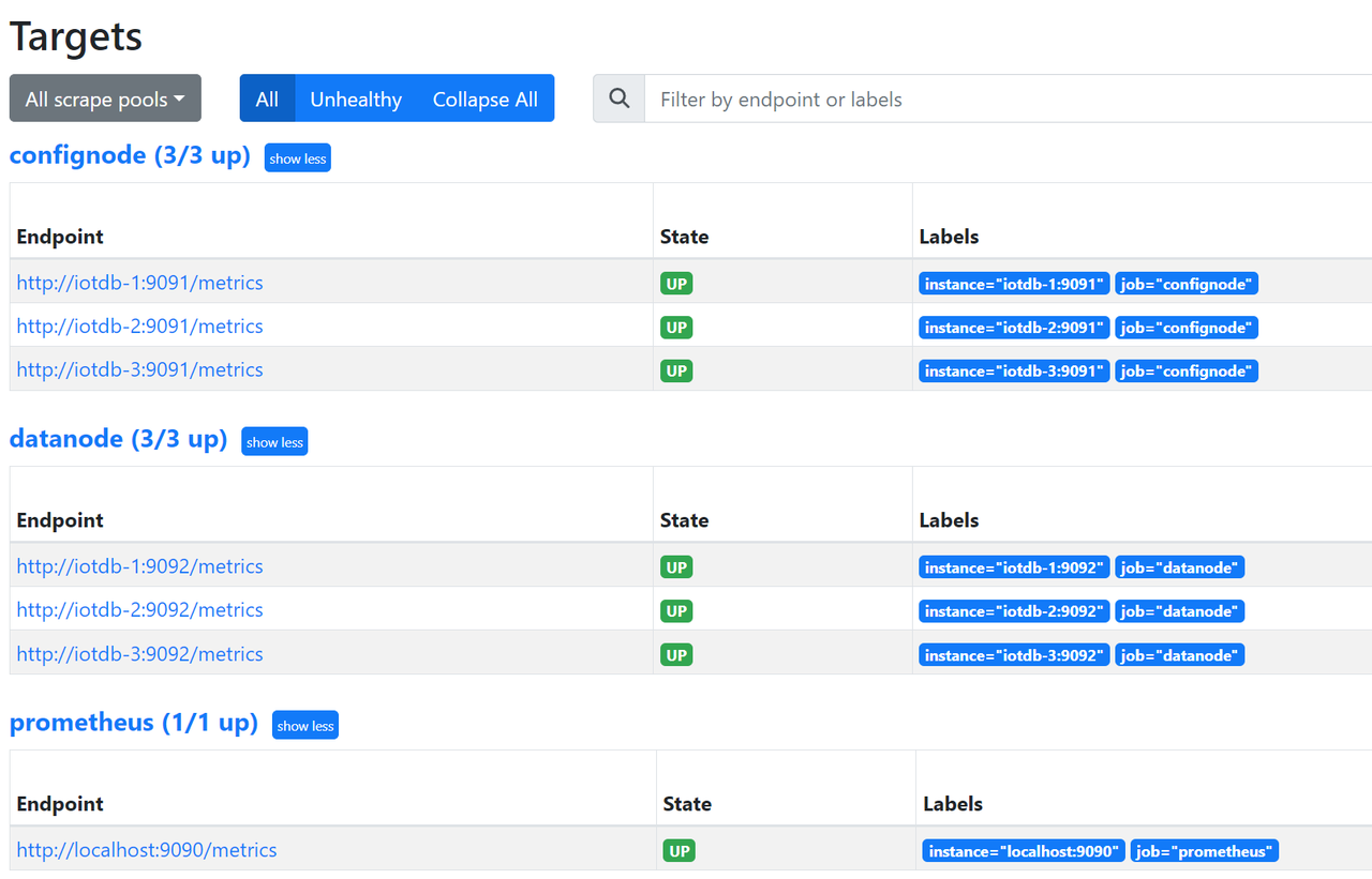 global: scrape_interval: 15s evaluation_interval: 15s scrape_configs: - job_name: "prometheus" static_configs: - targets: ["localhost:9090"] - job_name: "confignode" static_configs: - targets: ["iotdb-1:9091","iotdb-2:9091","iotdb-3:9091"] honor_labels: true - job_name: "datanode" static_configs: - targets: ["iotdb-1:9092","iotdb-2:9092","iotdb-3:9092"] honor_labels: true启动Prometheus。Prometheus 监控数据的默认过期时间为15天,在生产环境中,建议将其调整为180天以上,以对更长时间的历史监控数据进行追踪,启动命令如下所示: